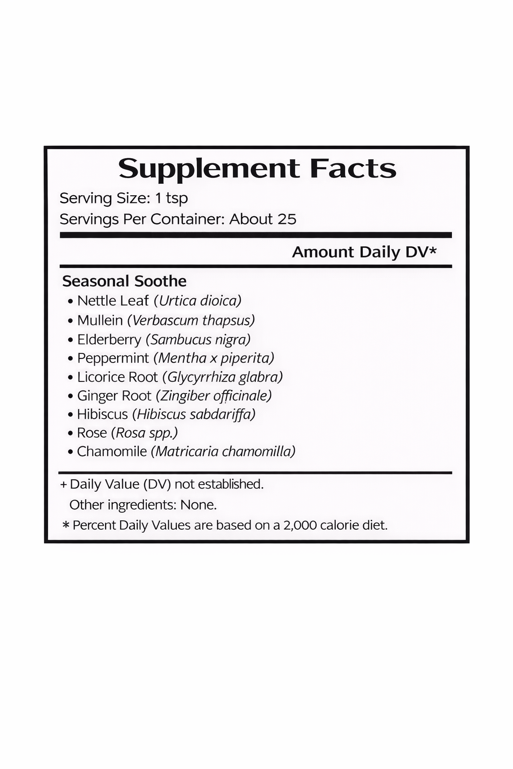 Seasonal Soothe is a comforting herbal blend inspired by the natural shift of the seasons. Thoughtfully crafted to encourage balance and ease during times of transition, this tea brings together grounding nettle and mullein with the gentle brightness of elderberry and peppermint. Floral notes of rose, chamomile, and hibiscus add softness, while ginger and licorice provide warmth and depth to each cup.