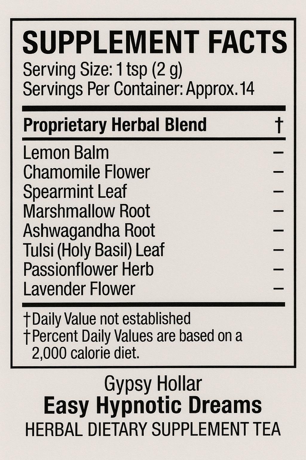 Created for quiet evenings and restful routines, Easy Hypnotic Dreams is a soothing herbal blend crafted to support relaxation at the end of the day. Made with lemon balm, chamomile, spearmint, marshmallow root, ashwagandha, tulsi, nettle leaf, passionflower, and a touch of lavender, this tea offers a soft, comforting flavor with gentle floral notes and a calming herbal finish.