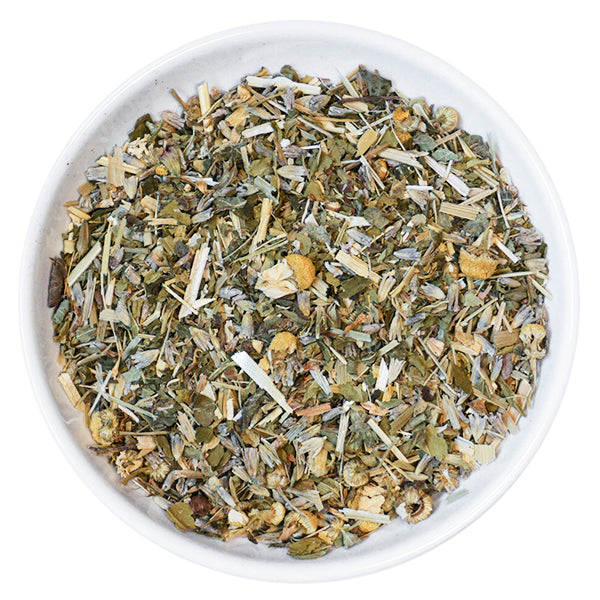 Lemon Balm (Melissa officinalis), Chamomile (Matricaria chamomilla), Spearmint (Mentha spicata), Marshmallow Root (Althaea officinalis), Ashwagandha (Withania somnifera), Tulsi (Ocimum tenuiflorum), Nettle Leaf (Urtica dioica), Passionflower (Passiflora incarnata), Lavender (Lavandula angustifolia)