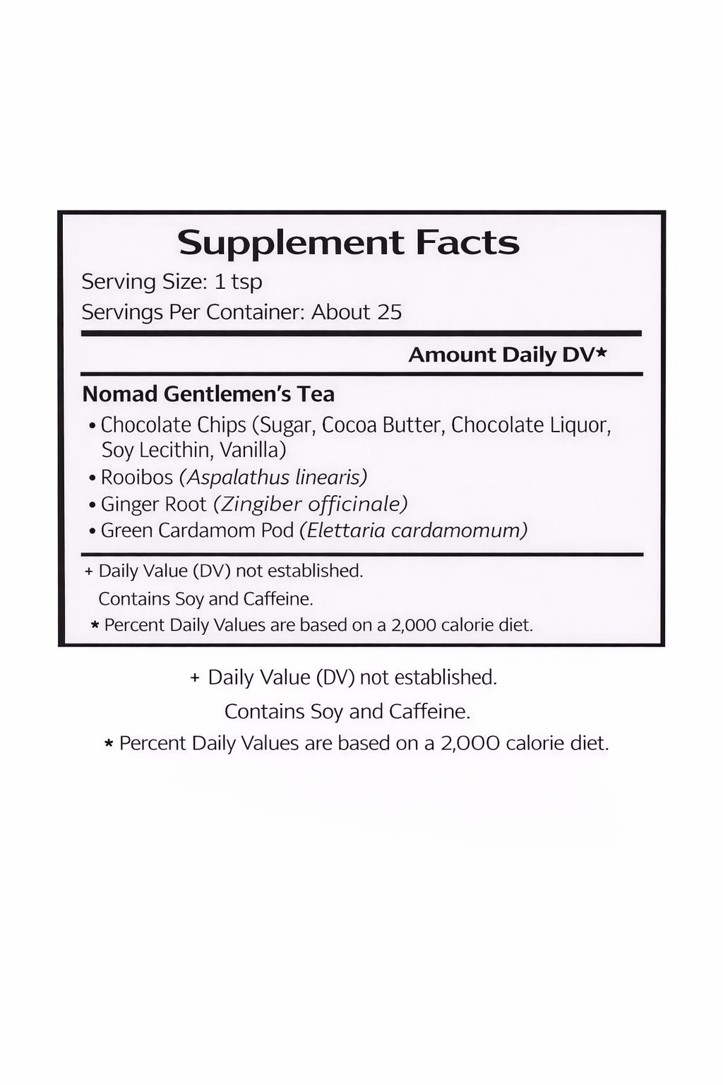 Nomad Gentlemen’s Tea is a rich, chai-inspired blend crafted for slow mornings and quiet evenings alike. Earthy rooibos and warming ginger root form the backbone of this comforting cup, while green cardamom adds gentle spice and depth. Finished with a smooth touch of chocolate, this blend delivers a balanced, indulgent flavor that feels both grounding and familiar.